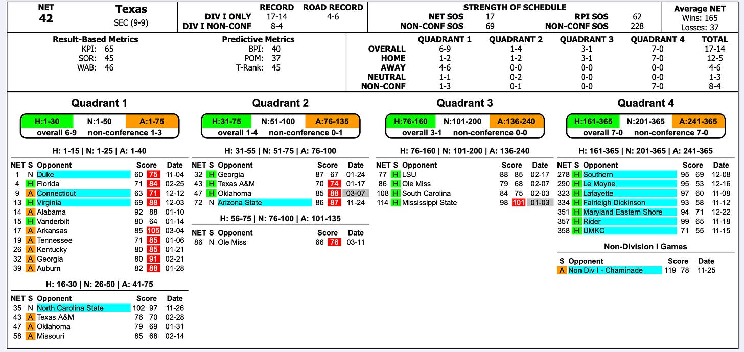 BracketMatrix’s composite field had Texas as the last team all day on Friday. It had Auburn as the first team out. There seems to be a fair amount of consensus, if not outright groupthink, on this: Auburn was selected in just 20 of the 121 brackets submitted to the matrix. But should there be? Here’s UT’s team sheet: