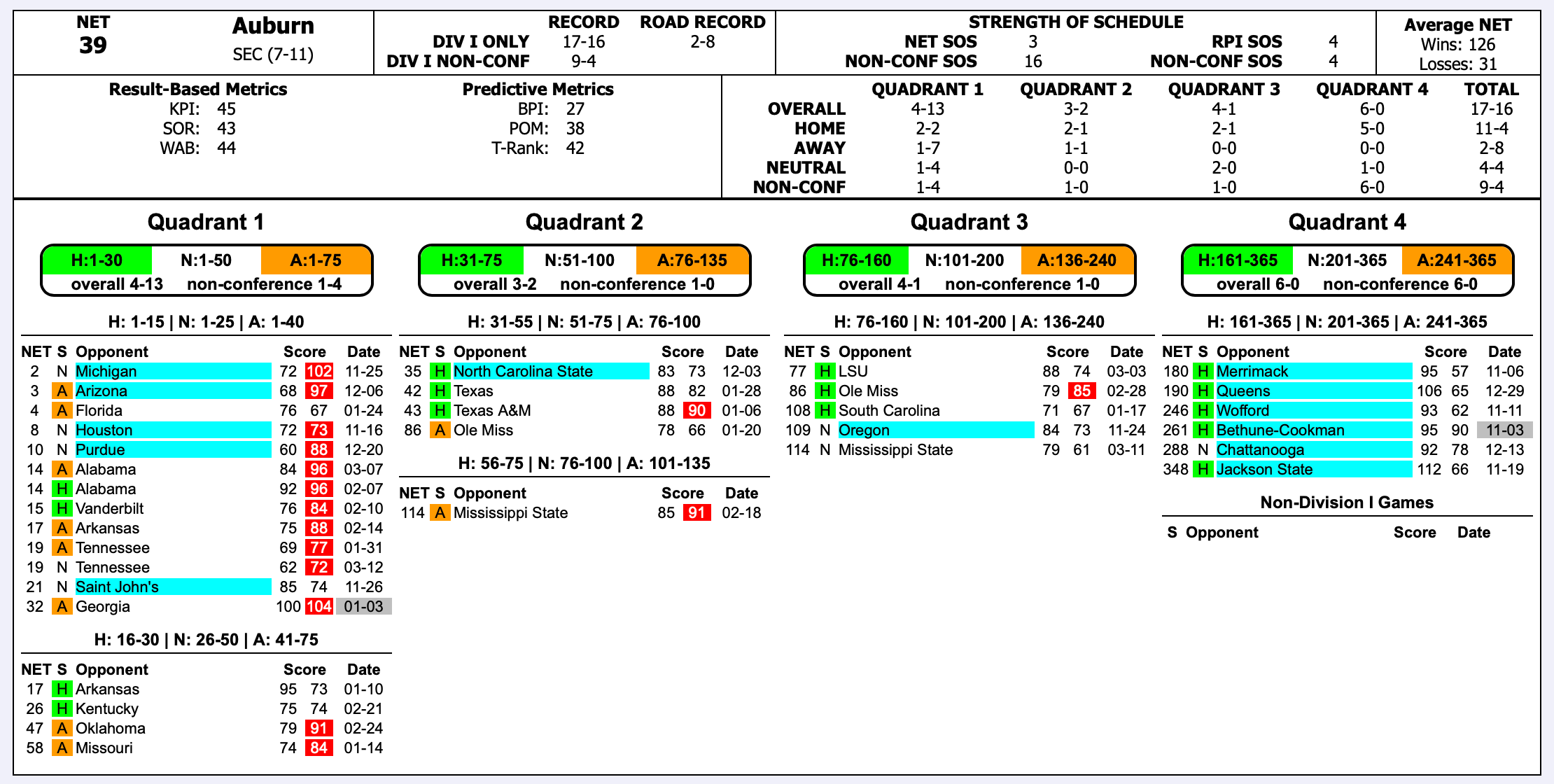 The point is broader: After weeks of mid-major vs. power conference selection discourse, after all that Miami back and forth, this is who Auburn is in actual bubble competition with: another mediocre 17-win team from their own league. It’s more accurate, but less dramatic.