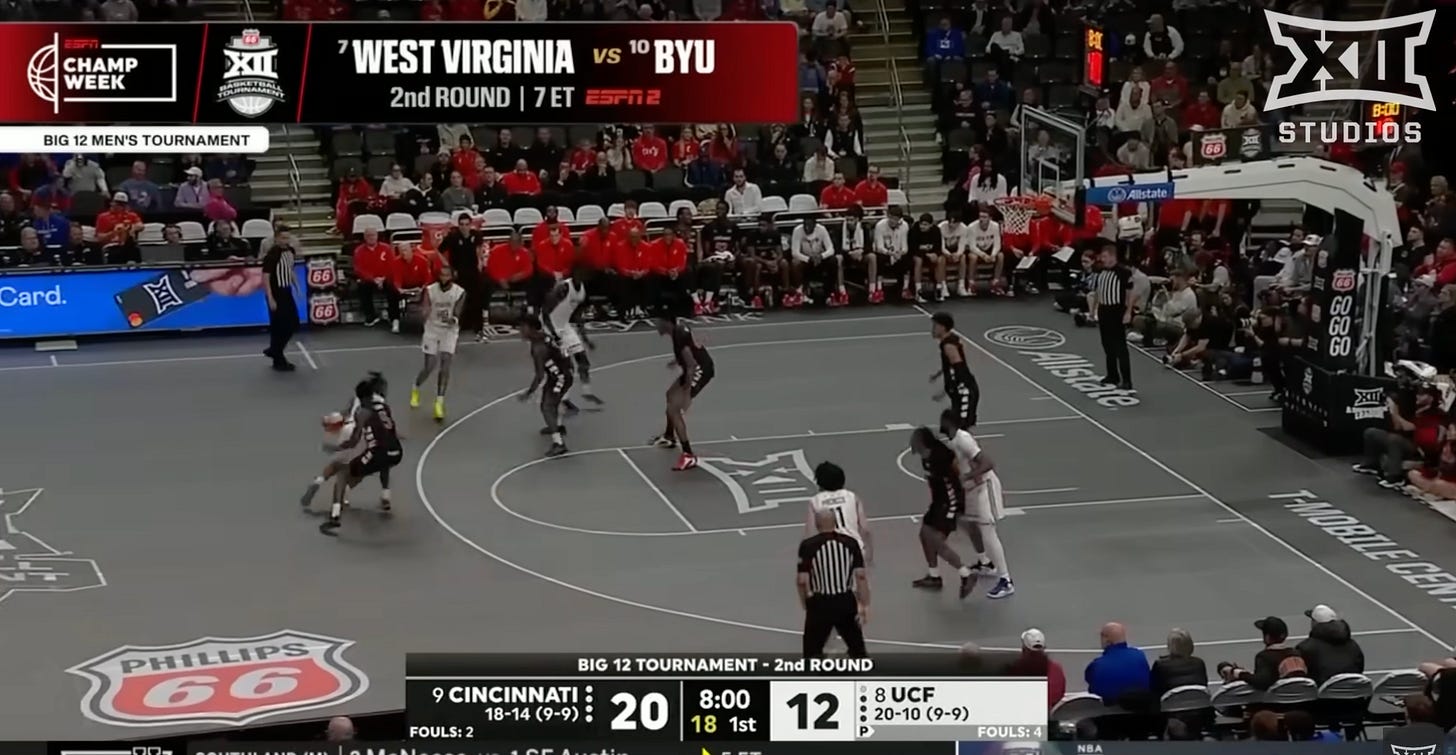 UCF (21-10, 9-9; NET: 51, WAB: 38): First of all: There was a lot of hype about the court at the Big 12 tournament. It’s basically a big LED screen! It can change graphics and colors! We can do anything we want with it! The future is now! Cool. So why did you take the fill tool on Microsoft Paint and make the entire court gray?