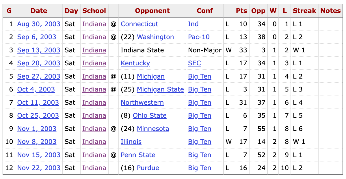My first season as an Indiana football fan was the fall of 2003. I was a freshman. My buddies and I ordered our student season tickets, because that’s what we assumed you did when you were a student at a Big Ten college: You went to the football games. Here are that season’s results: