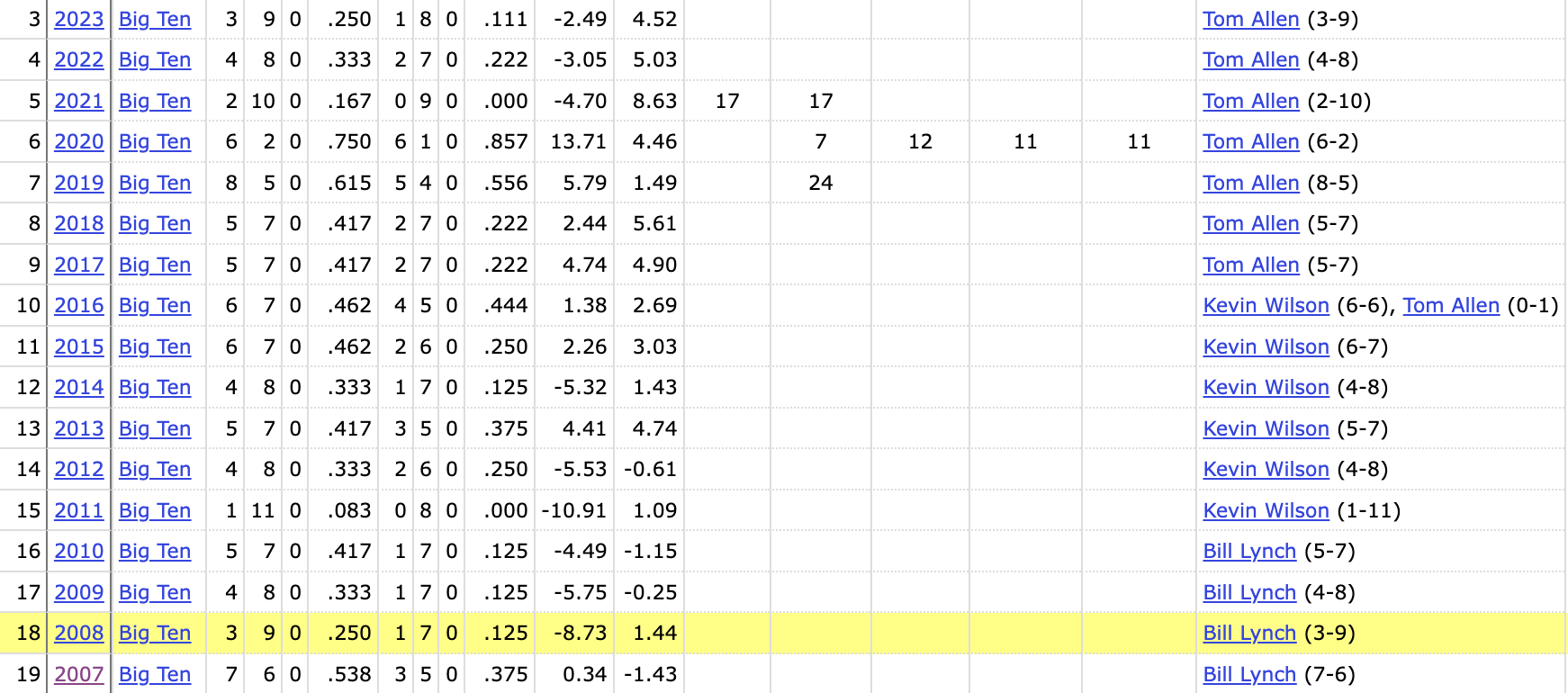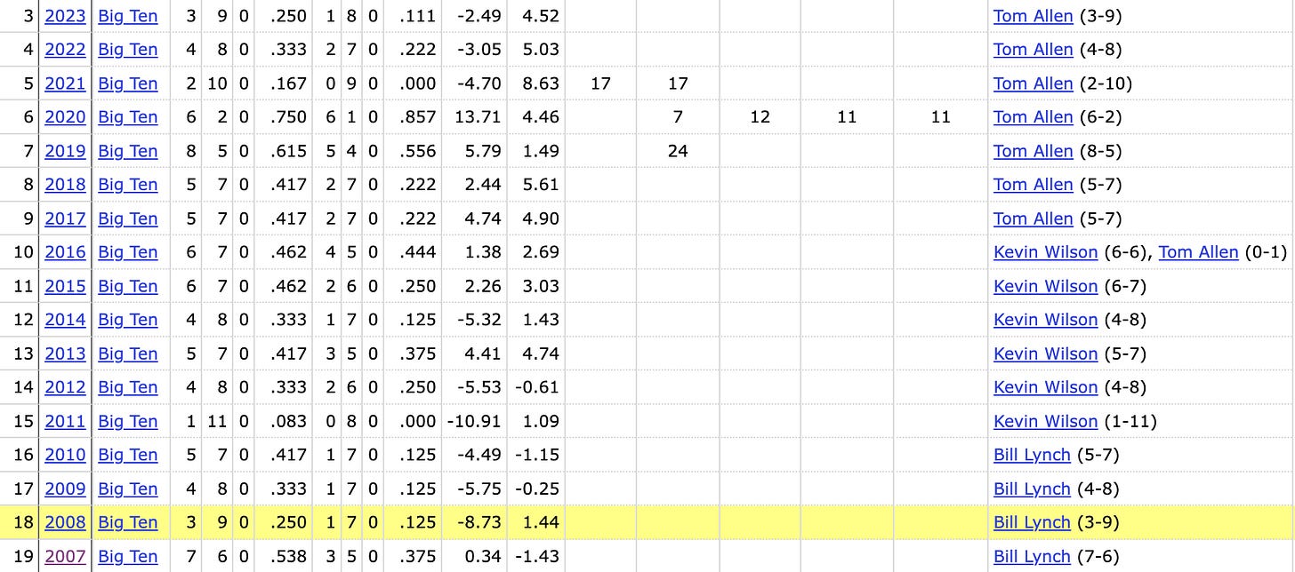 For Indiana: a 7-6 season in 2007, which I remember taking some note of at, like, Duffy’s, followed by this: