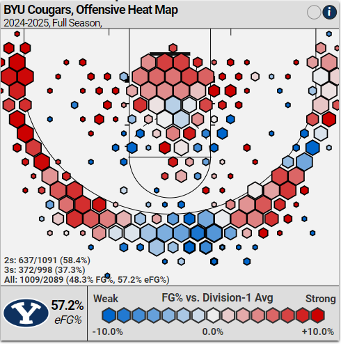 Now: There are some subtle differences in how both teams go about getting these shots — BYU is absolutely not as hellbent on getting up the floor as quickly as Alabama — but the end results for Kevin Young’s team are functionally the same as Nate Oats’. You take a 3, or you get to the rim, and when you get to the rim if a clean shot isn’t there you kick it back out the perimeter and begin the process anew. Midrange attempts are essentially verboten. Expect to hear a lot of “well, this is the analytics, they love the analytics” stuff from Brian Anderson and Jim Jackson on the call. It will be tinged with a hint of disgust. Your mileage may vary. We happen to be thrilled that college basketball has become a big enough tent to include NBA-style influences like Oats and Young, while also allowing Ben McCollum to play the slowest tempo in recorded history and still take Drake to the second round of the tournament. It’s great! And it’s all fun to watch!